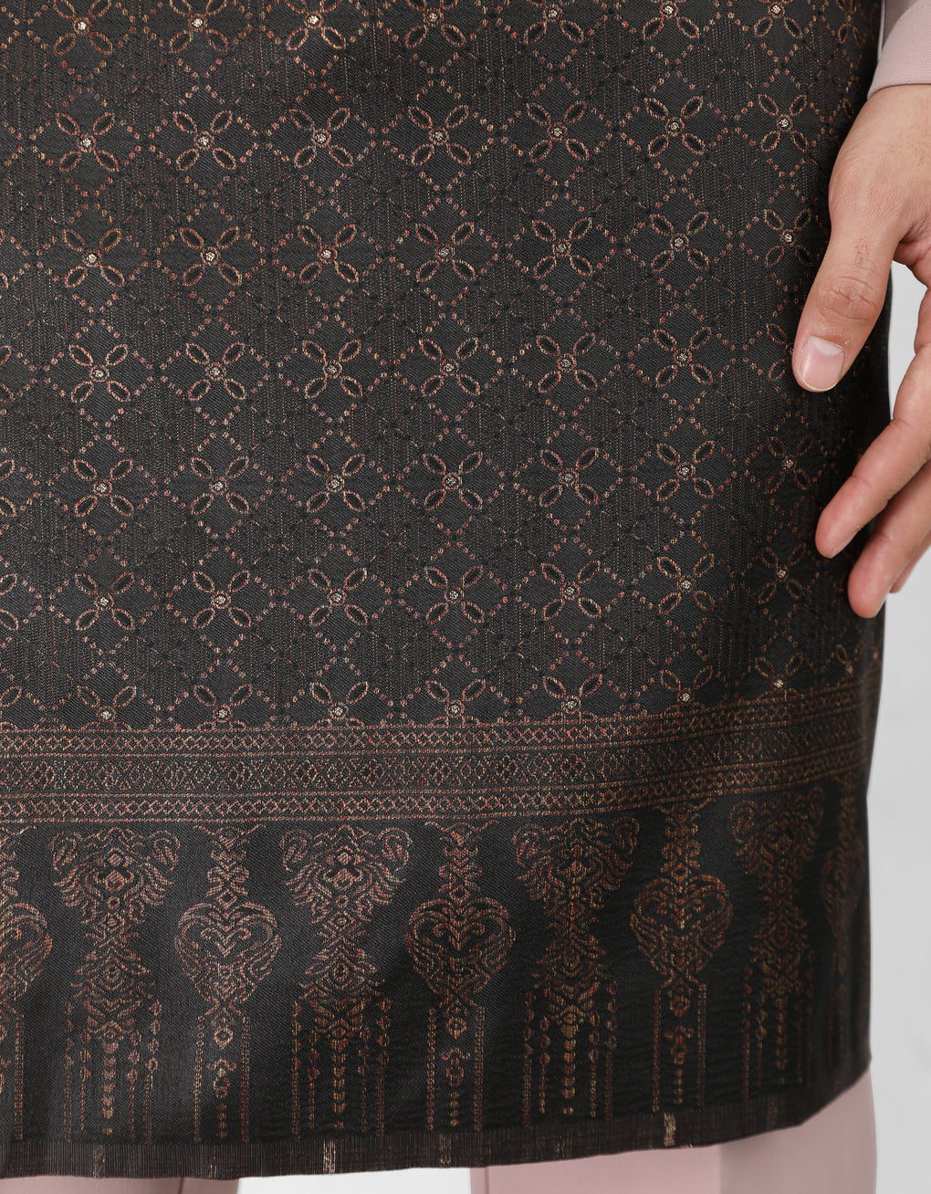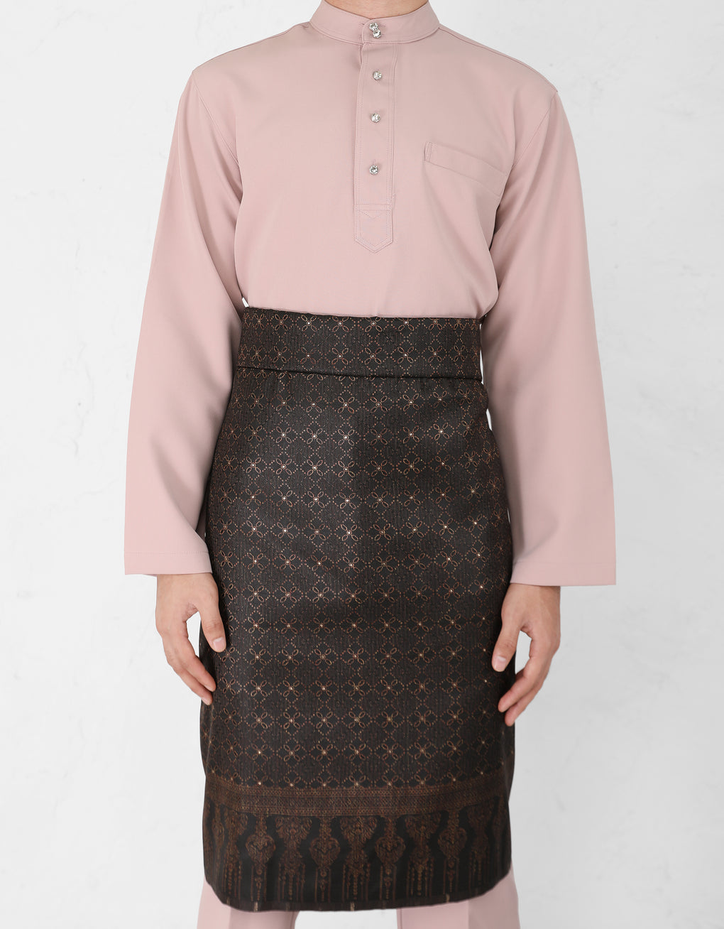 No matter the Baju Melayu style, Samping is the statement piece that completes the traditional attire. The most common style is the 'ikatan lingkup' where the sampin is first folded tightly across the chest, then rolled down to hold the cloth in place.