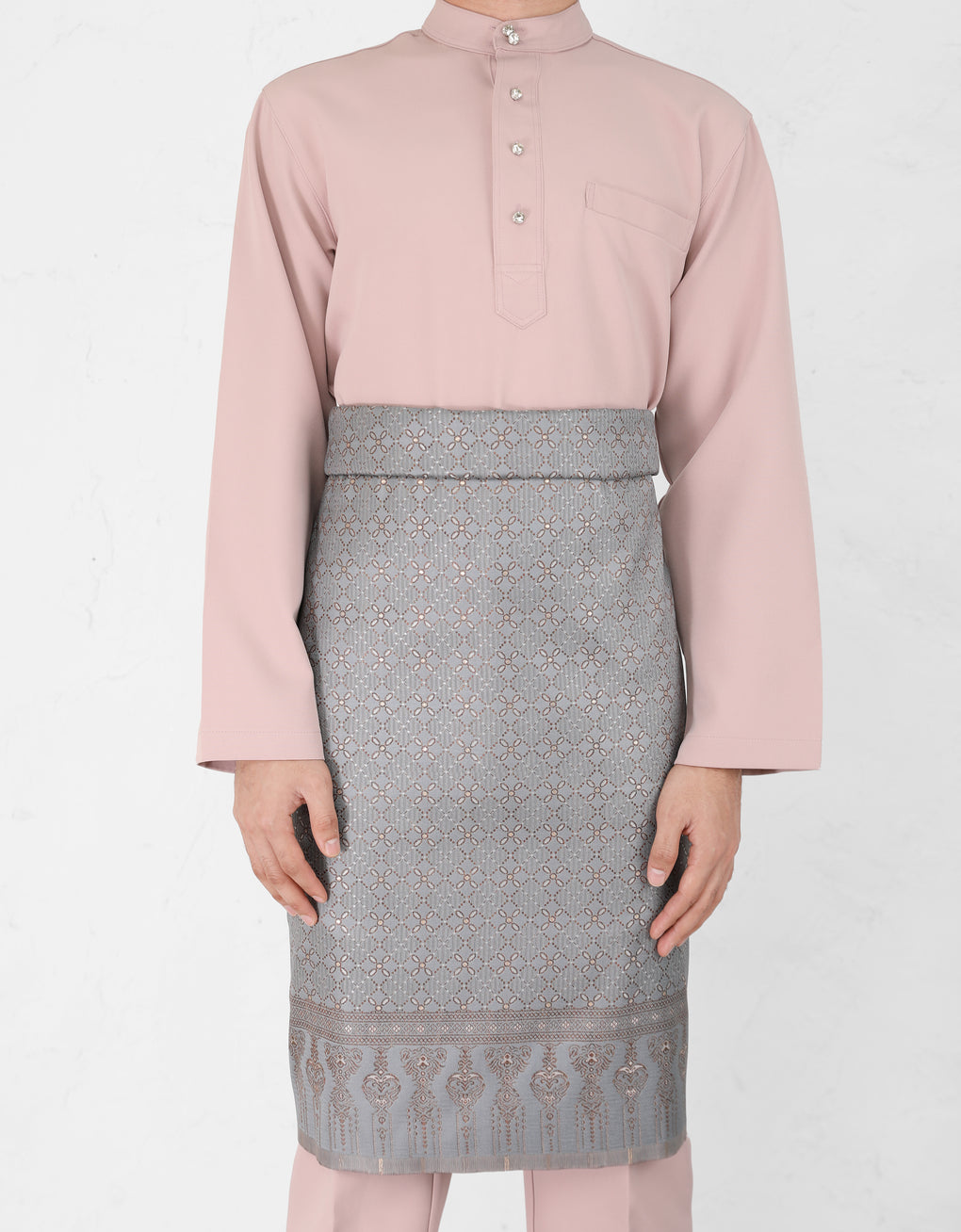 No matter the Baju Melayu style, Samping is the statement piece that completes the traditional attire. The most common style is the 'ikatan lingkup' where the sampin is first folded tightly across the chest, then rolled down to hold the cloth in place.