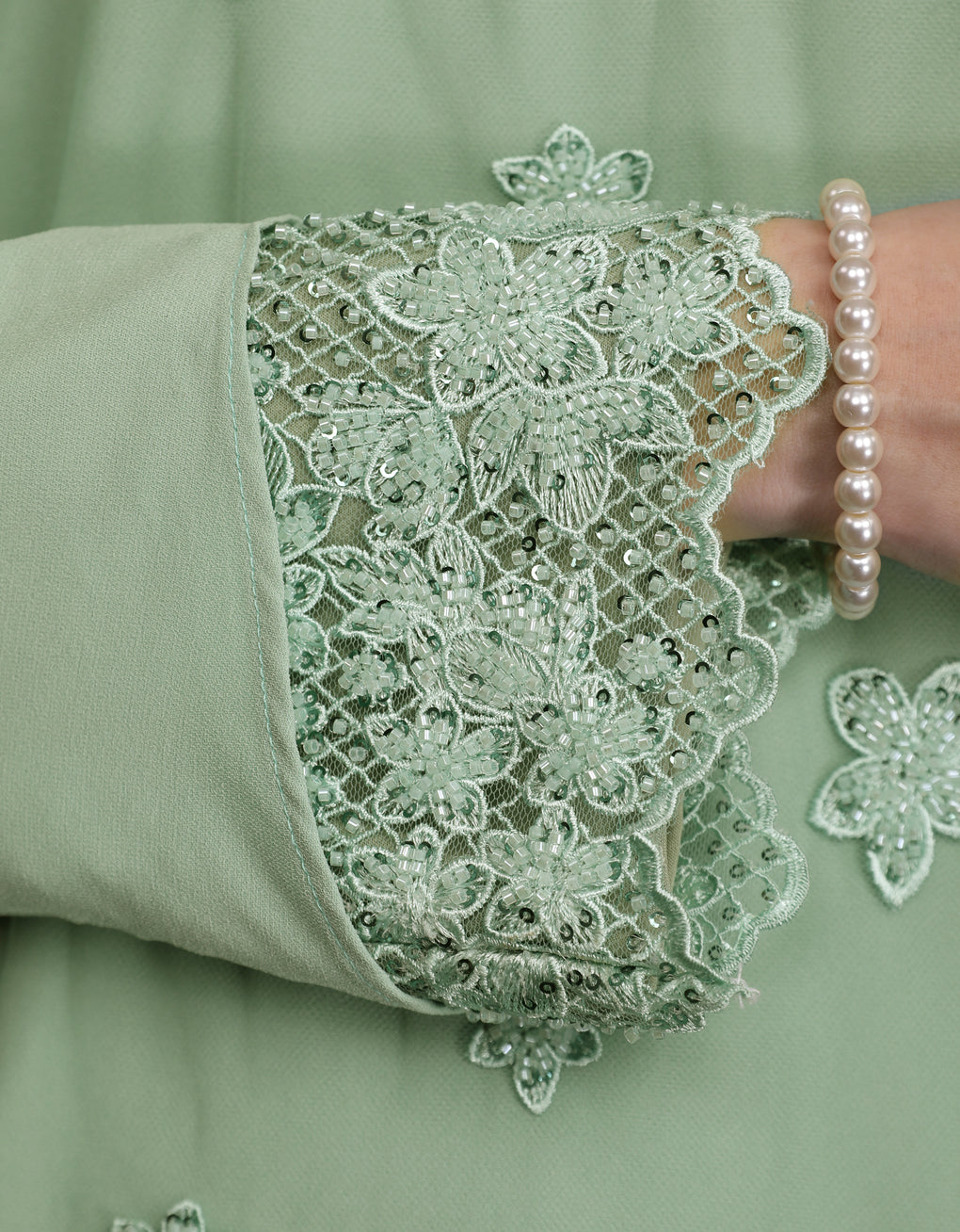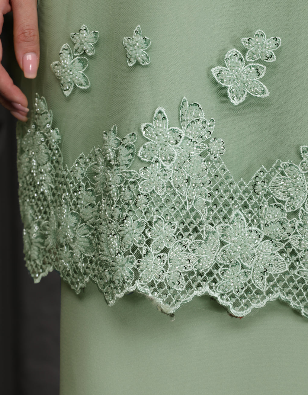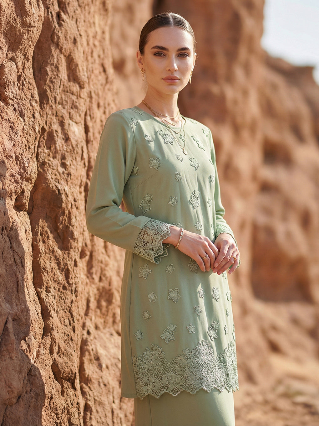 Baju Kurung Moden Aluna Luxurious and exclusive beaded lace delicately sewn for a rich and stunning look. The interlining are made of soft hand-feel jojo crepe fabric.