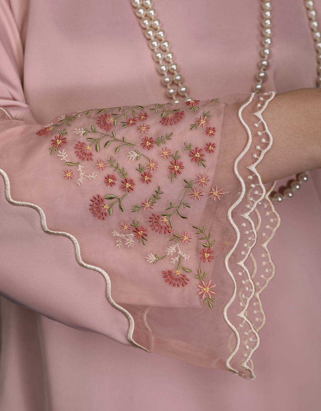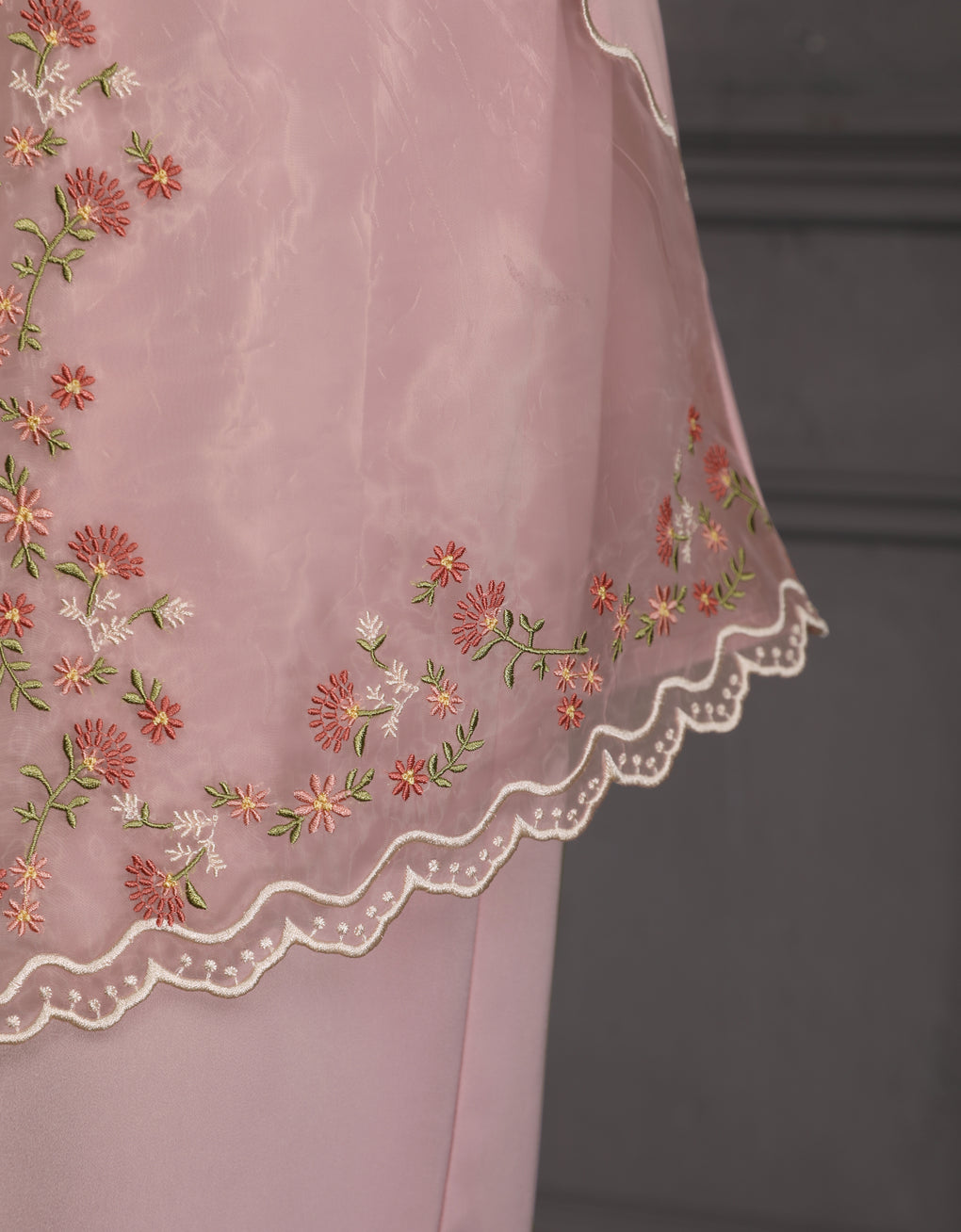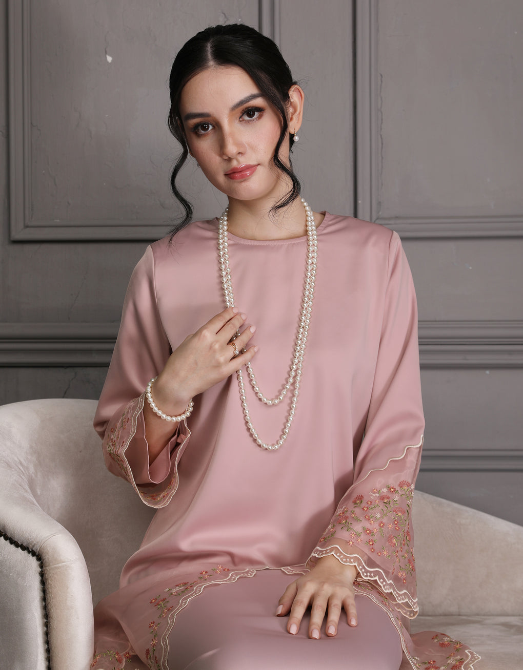 'Baju Kurung Pahang Moden Aurelia' blends tradition with a modern touch. Made from premium Italian Silky Satin, this piece features delicate embroidery on soft organdy that enhances its refined look. It offers both elegance and comfort in a long, flattering silhouette. A timeless choice for formal events or refined everyday wear.