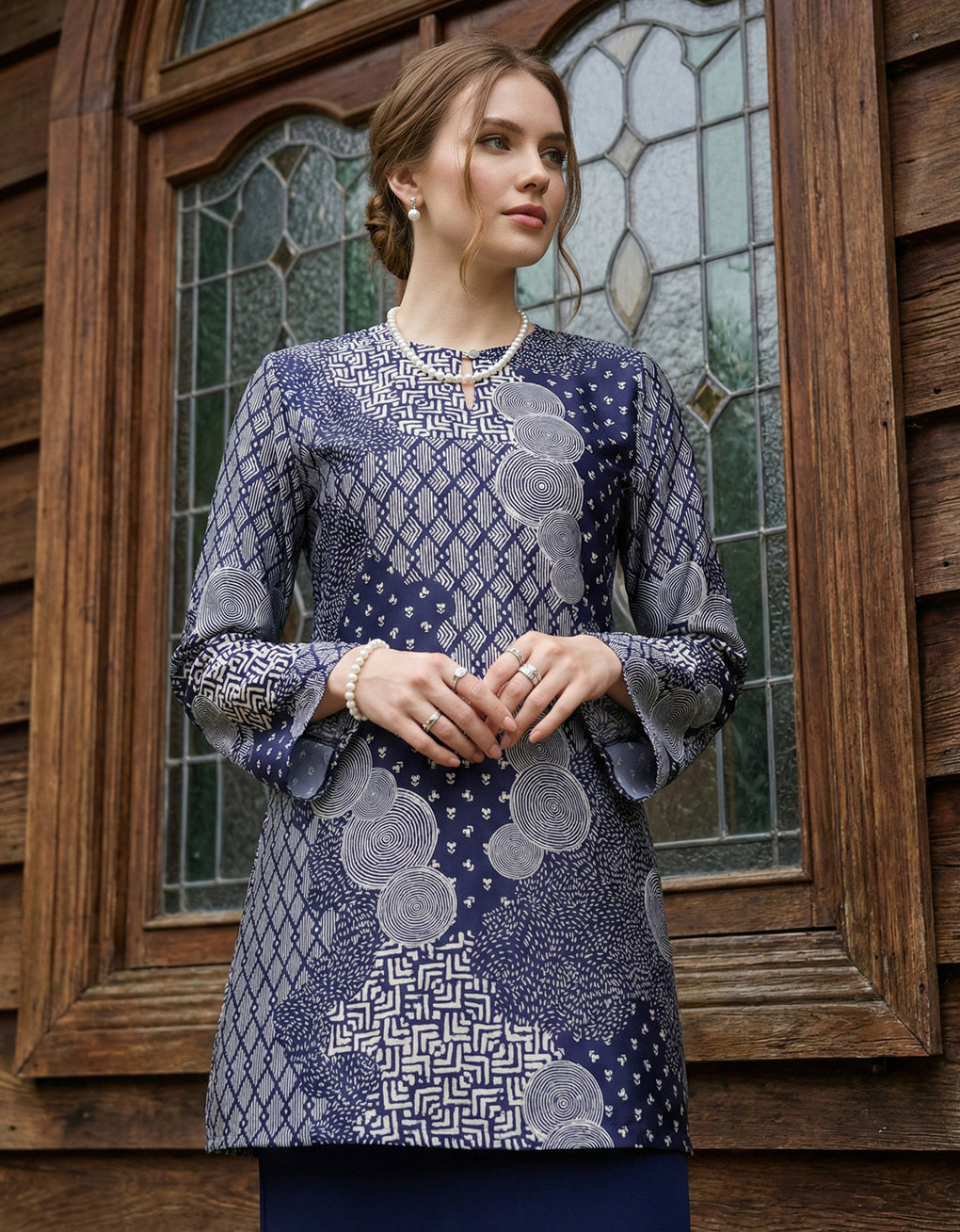 Material: Armani Silky Satin - Smooth texture, with a glossy front and elegant draping, featuring unique batik patterns.