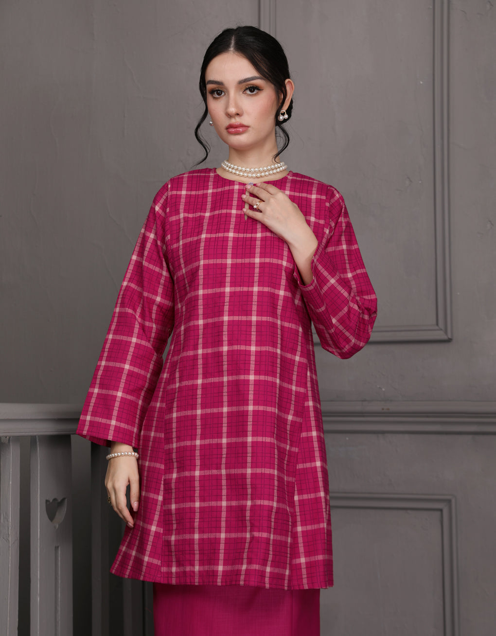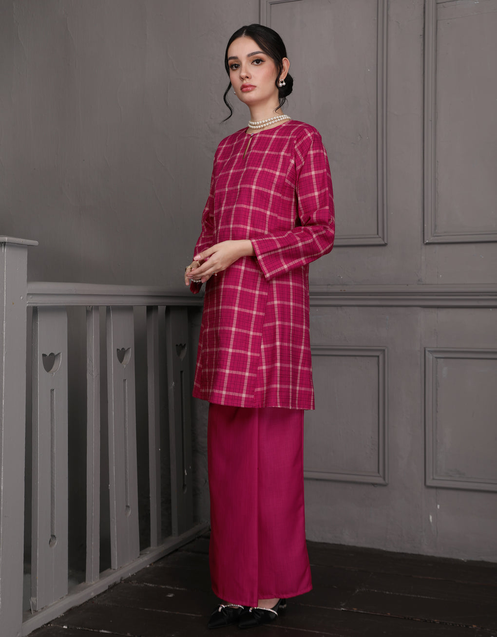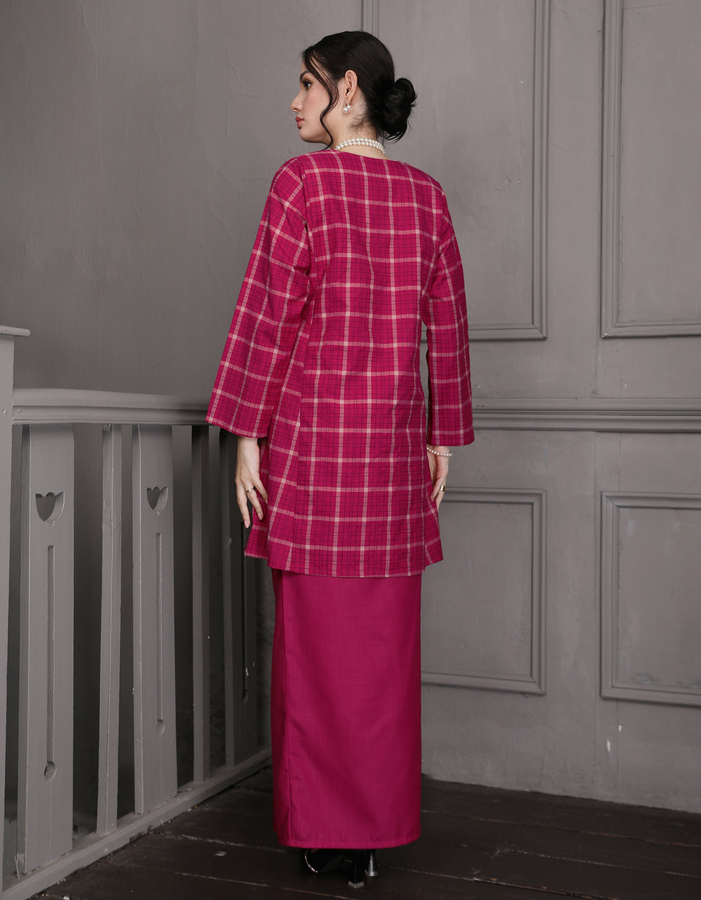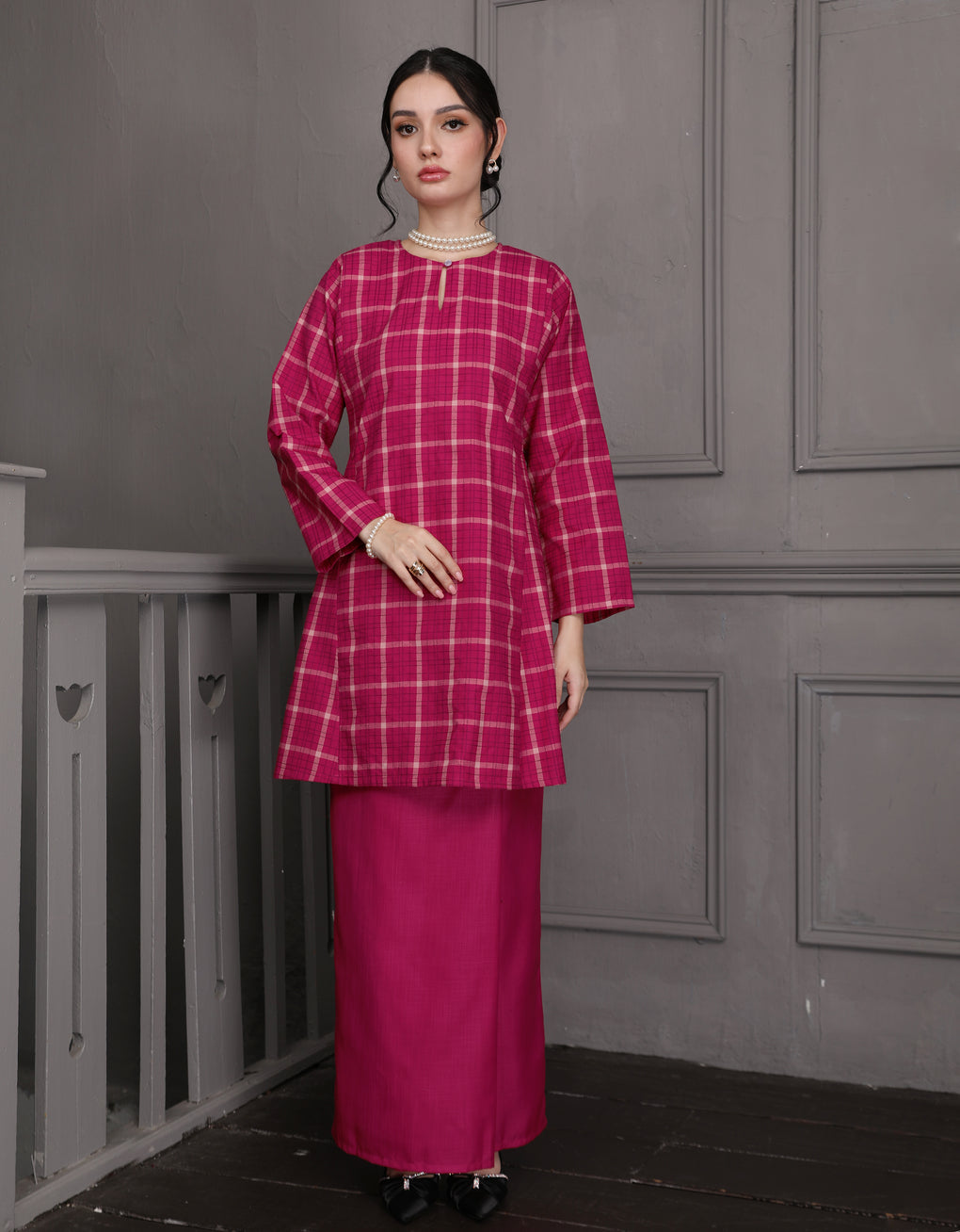 Baju Kurung Pahang Pesak Caryne Elevate your traditional wardrobe with this authentic Baju Kurung Pahang crafted from premium cotton check fabric. The classic Pesak Caryne design features the distinctive Pahang silhouette, renowned for its refined proportions and timeless elegance. Offers versatility for both everyday wear and special occasions, while the breathable cotton construction ensures comfort in Malaysia's tropical climate. Perfect for those who appreciate quality craftsmanship and cultural heritage in their everyday style.
