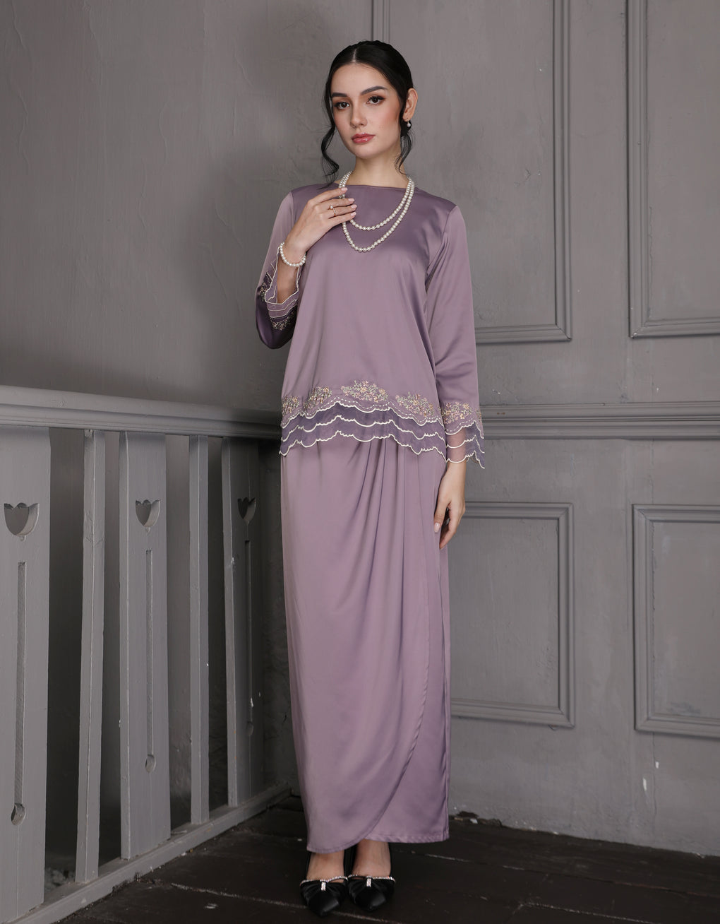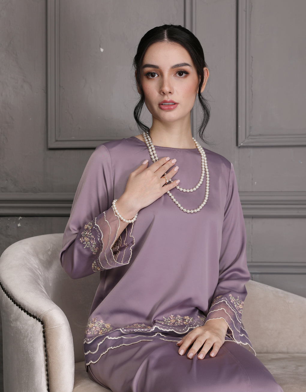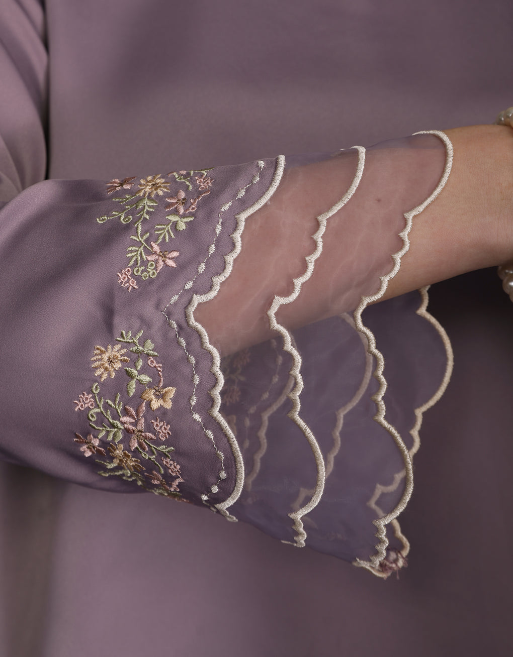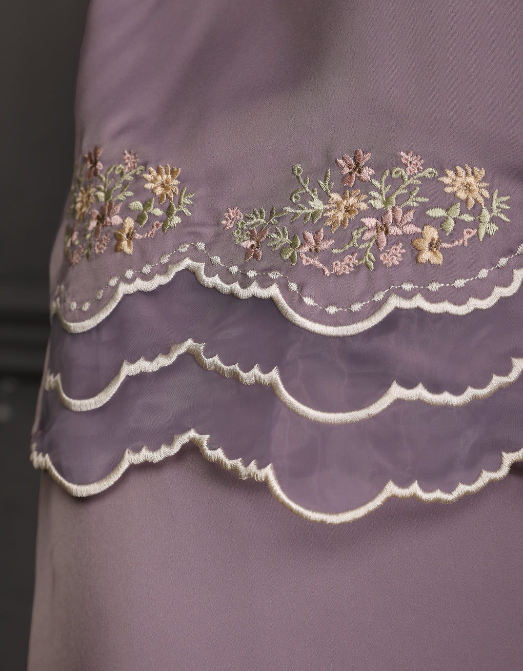'Baju Kurung Moden Harriet’ combines classic charm with modern elegance. Made from silky Italian satin and detailed with fine multicolor embroidery on the sleeves and hem, it looks stunning, luxurious, and feminine — perfect for formal events or graceful daily wear.