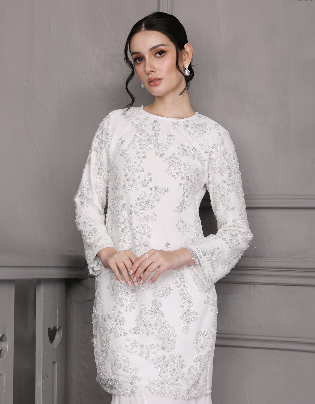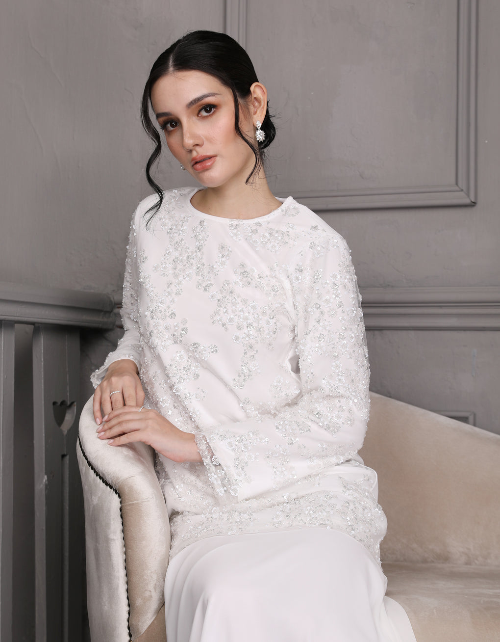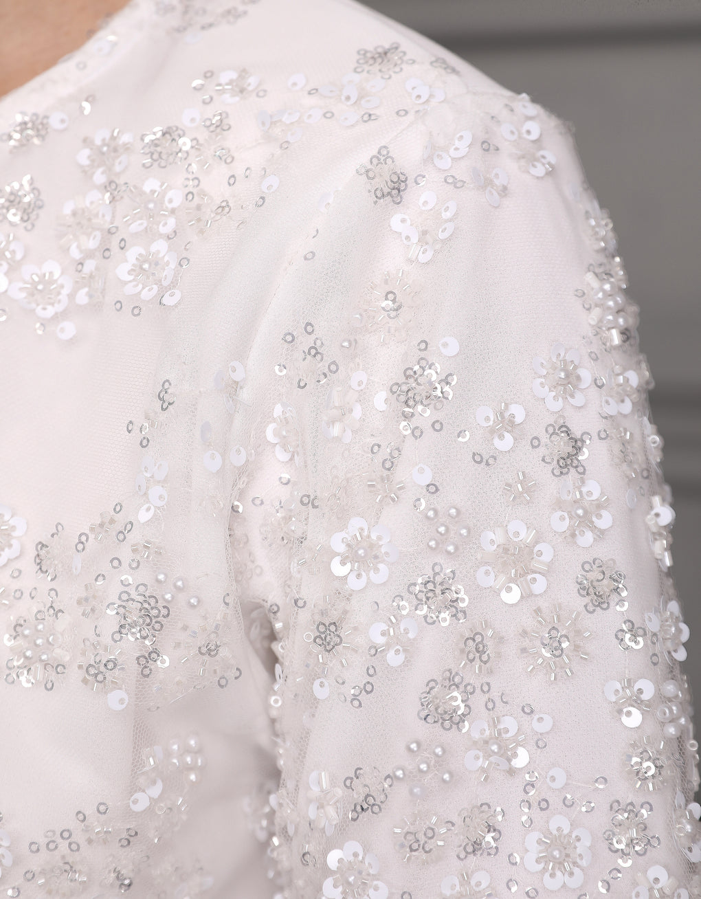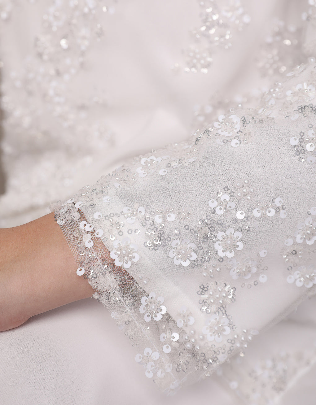 Luxurious and exclusive beaded lace delicately sewn for a rich and stunning look. The interlining are made of soft hand-feel jersey fabric.
