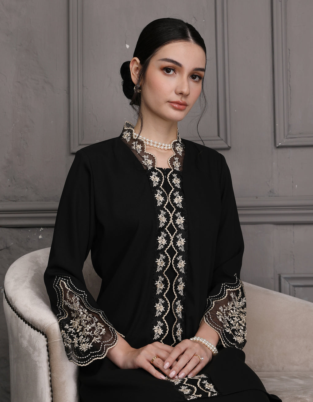 The 'Baju Kebaya Felisa' features luxurious Italian Silky Satin fabric, offering a smooth and elegant drape. Its scalloped neckline adds a refined touch, while the intricate Embroidered Organza detailing on the center and sleeves enhances its sophisticated appeal. This kebaya is an excellent choice for festive celebrations or formal events, combining traditional craftsmanship with contemporary elegance.