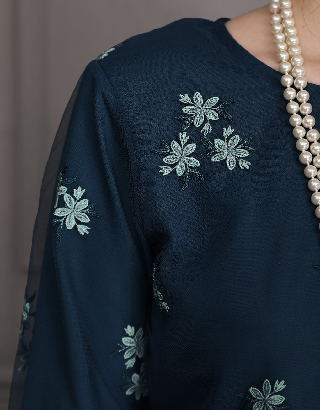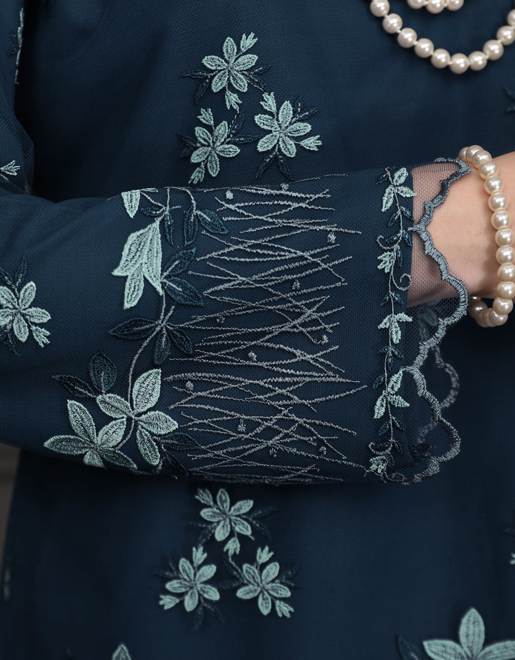 Crafted in a timeless Moden cut, this piece offers a comfortable fit. Delicate floral embroidered lace creates a graceful blend of femininity and elegance perfect for any occasion.