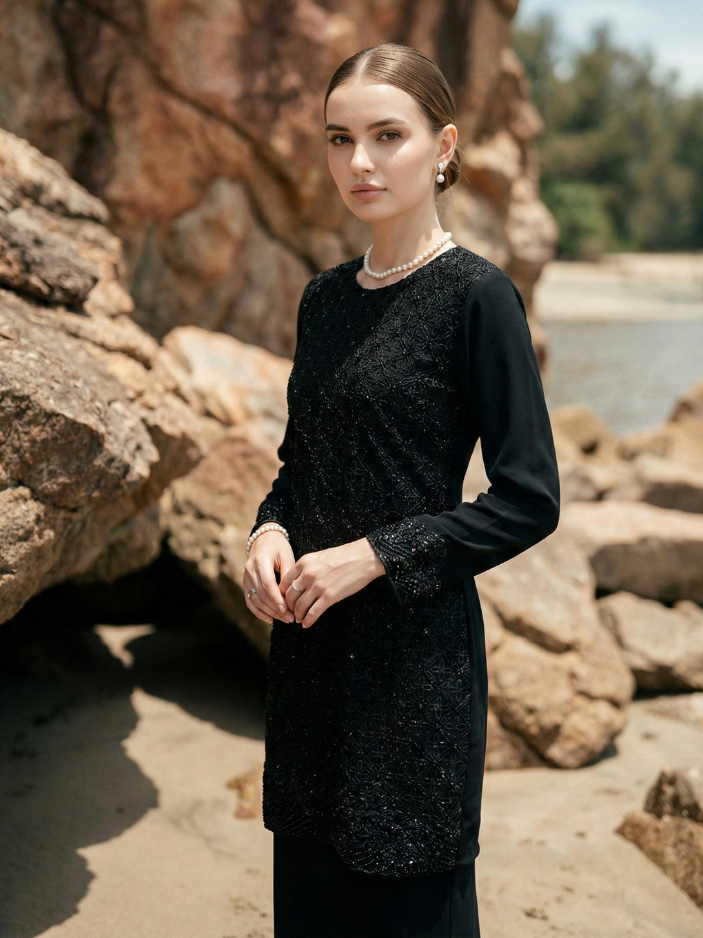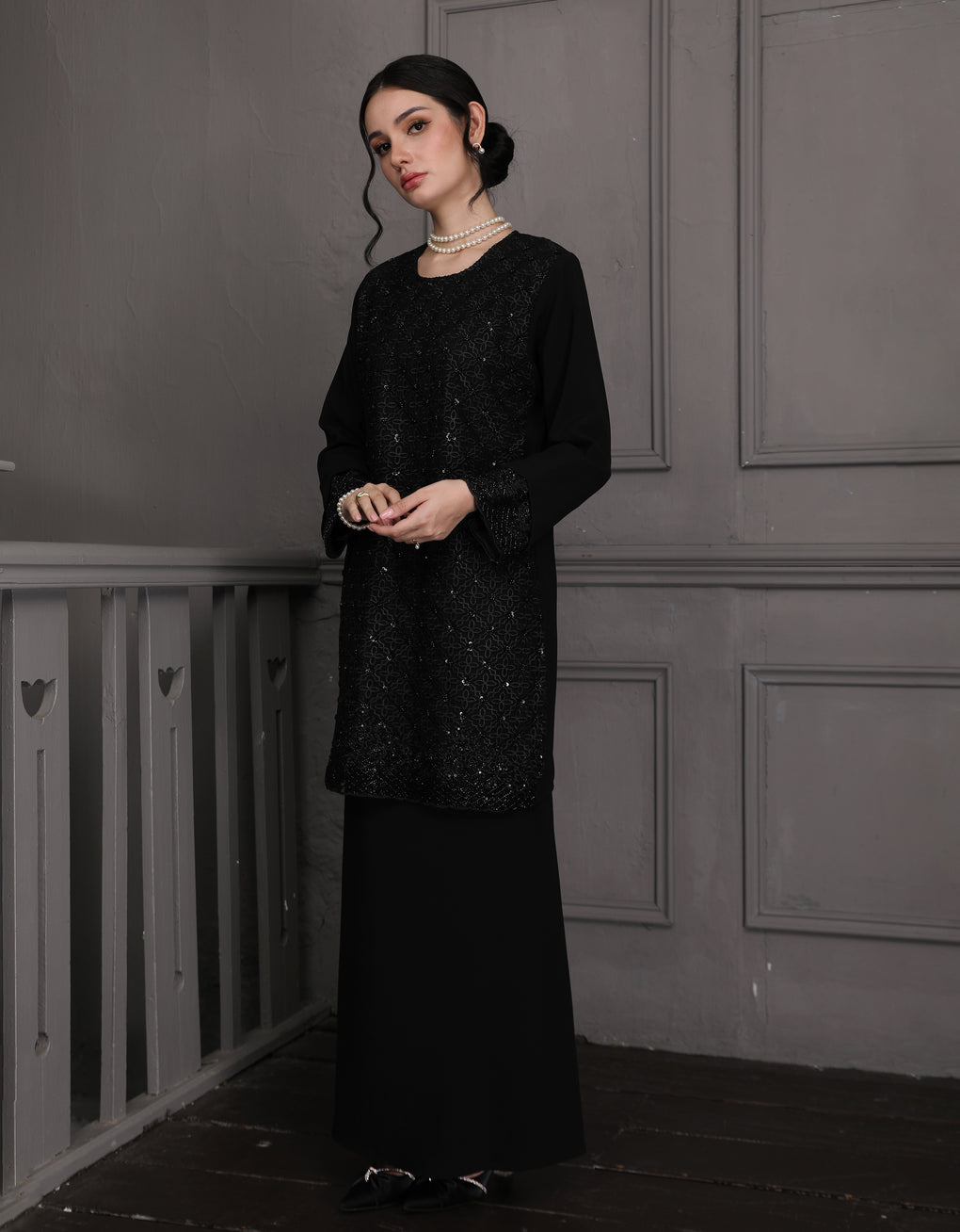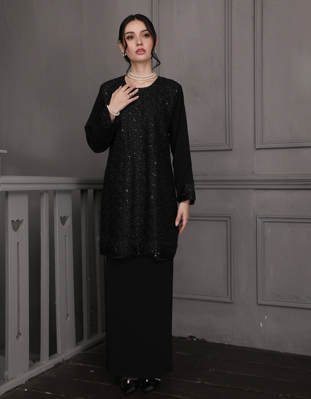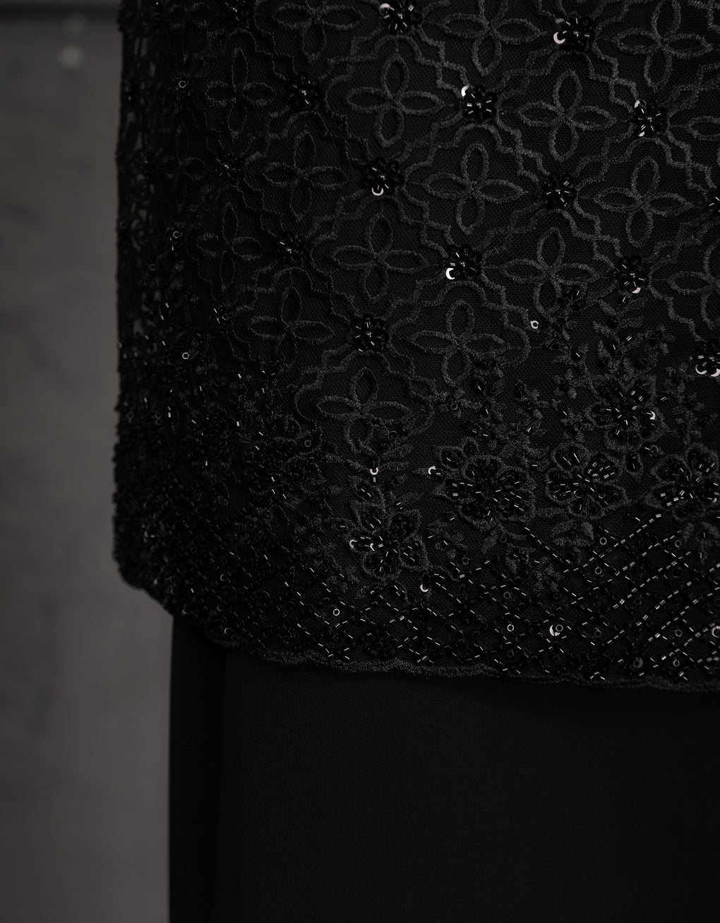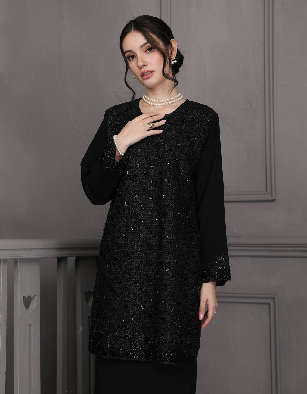 Baju Kurung Moden Dyani Luxurious and exclusive beaded lace delicately sewn for a rich and stunning look. The interlining are made of soft hand-feel jojo crepe fabric.