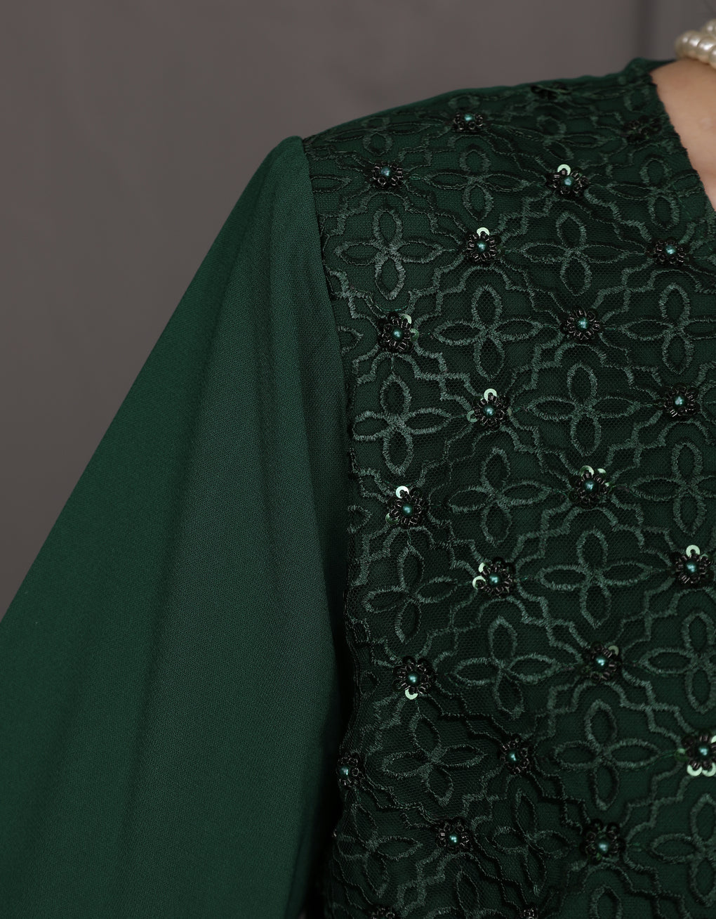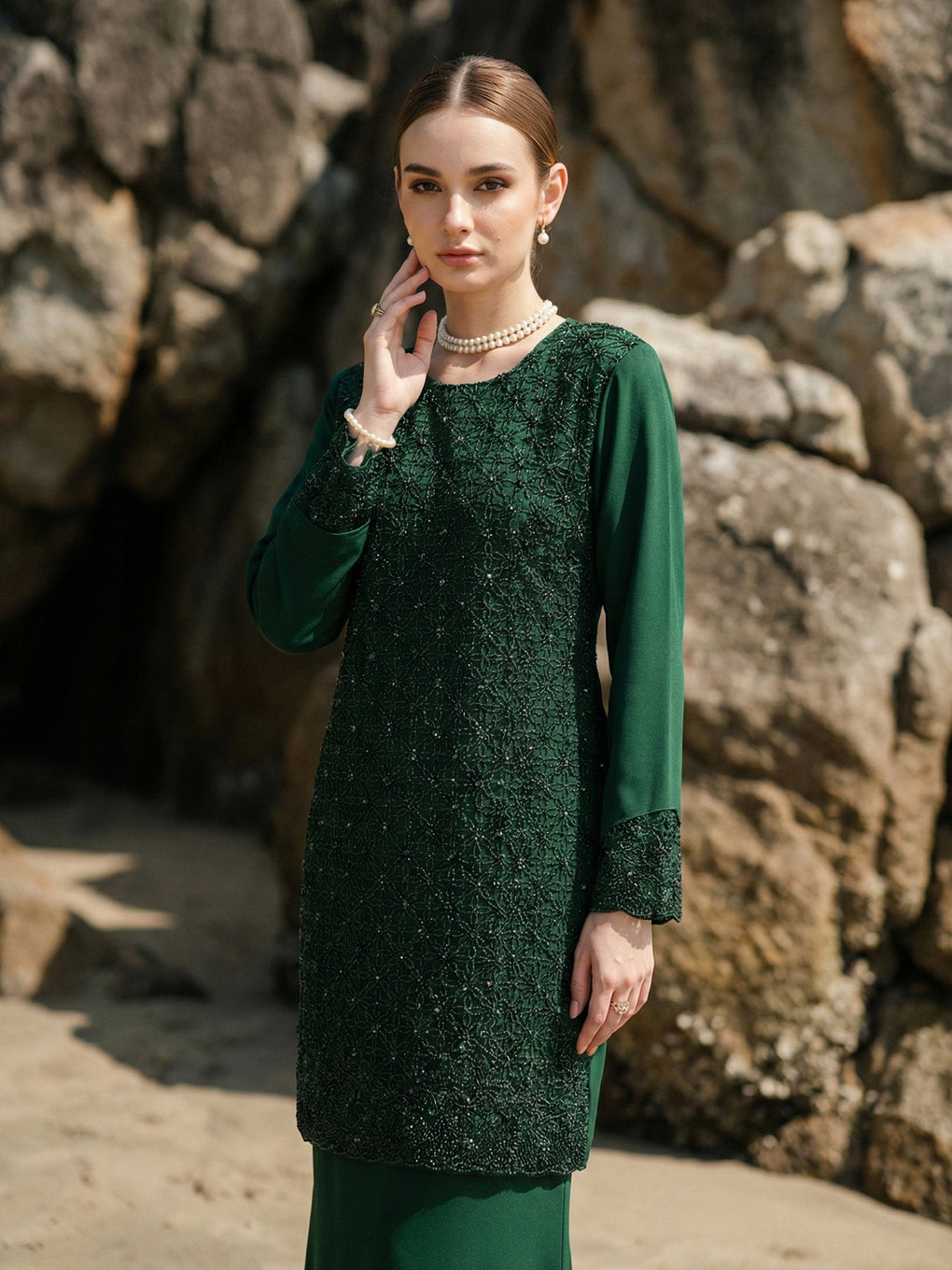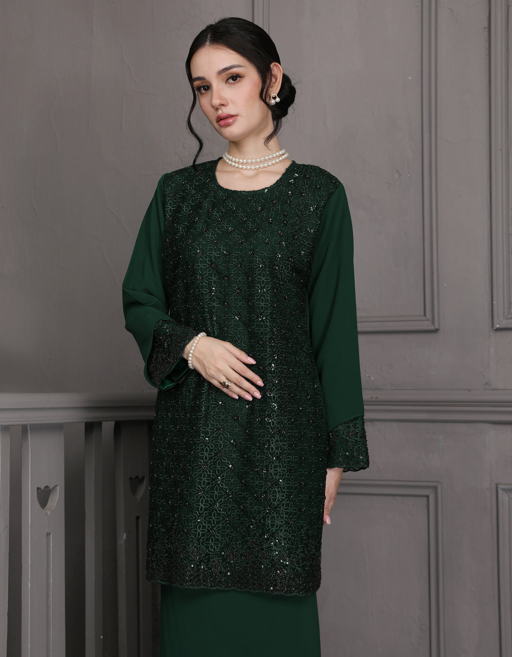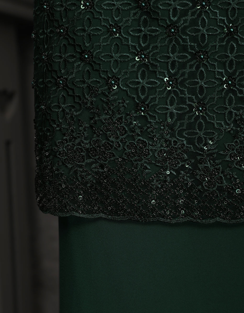 Baju Kurung Moden Dyani Luxurious and exclusive beaded lace delicately sewn for a rich and stunning look. The interlining are made of soft hand-feel jojo crepe fabric.