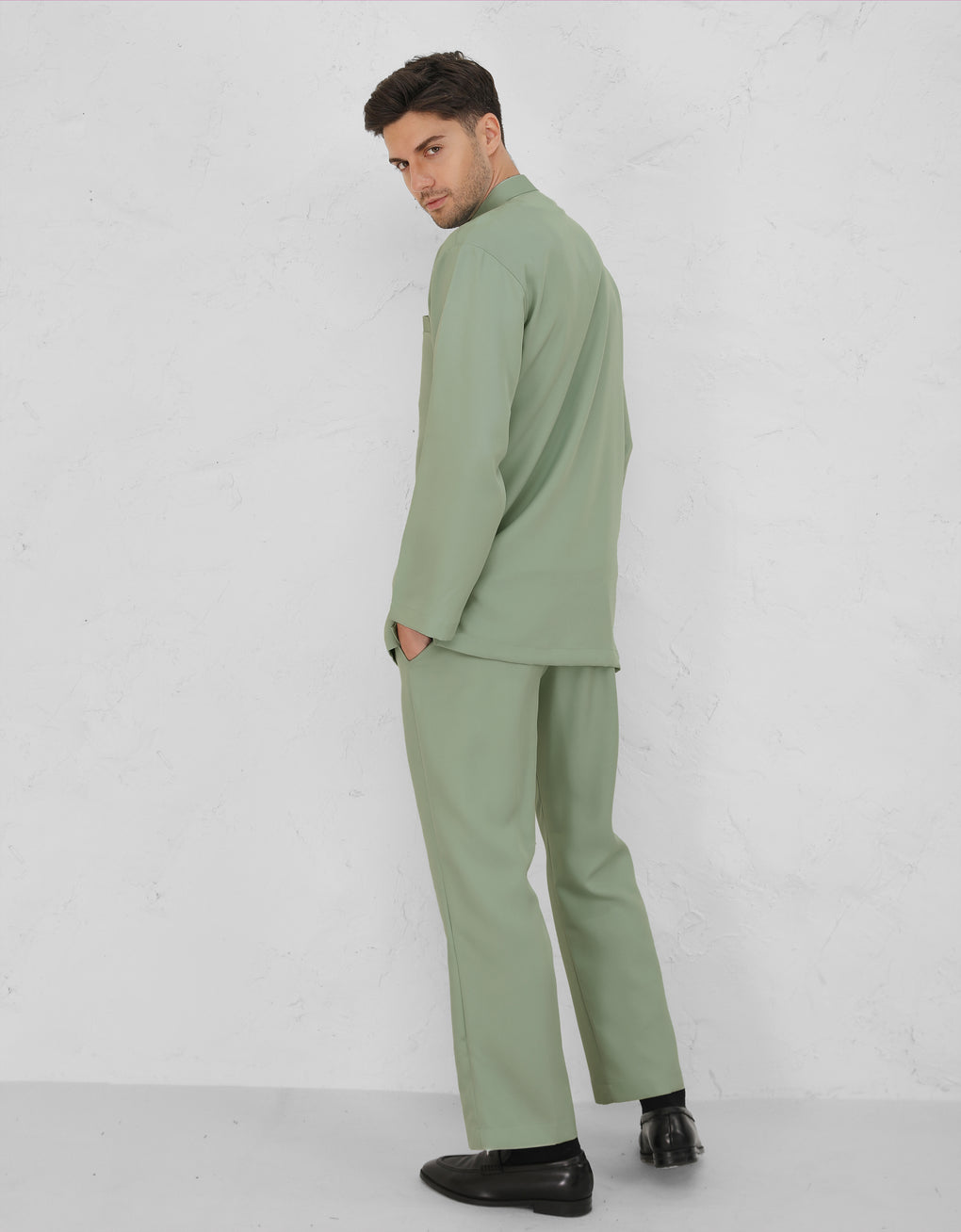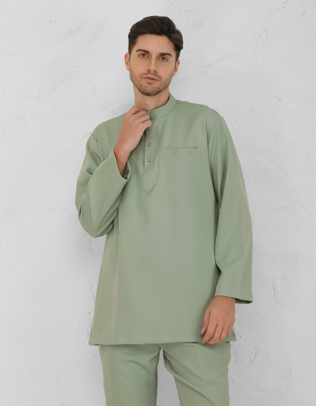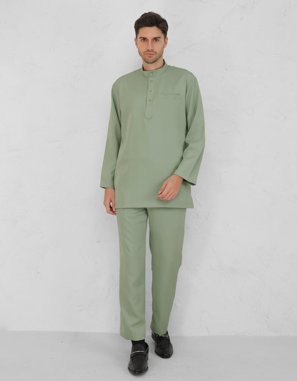 Crafted from italian crepe. A Modern take on the classic Baju Melayu Cekak Musang - clean lines, tailored fit, and refined details for a sleek traditional look. Perfect for Raya, Wedding or formal events. This timeless piece blends heritage with cotemporary style.