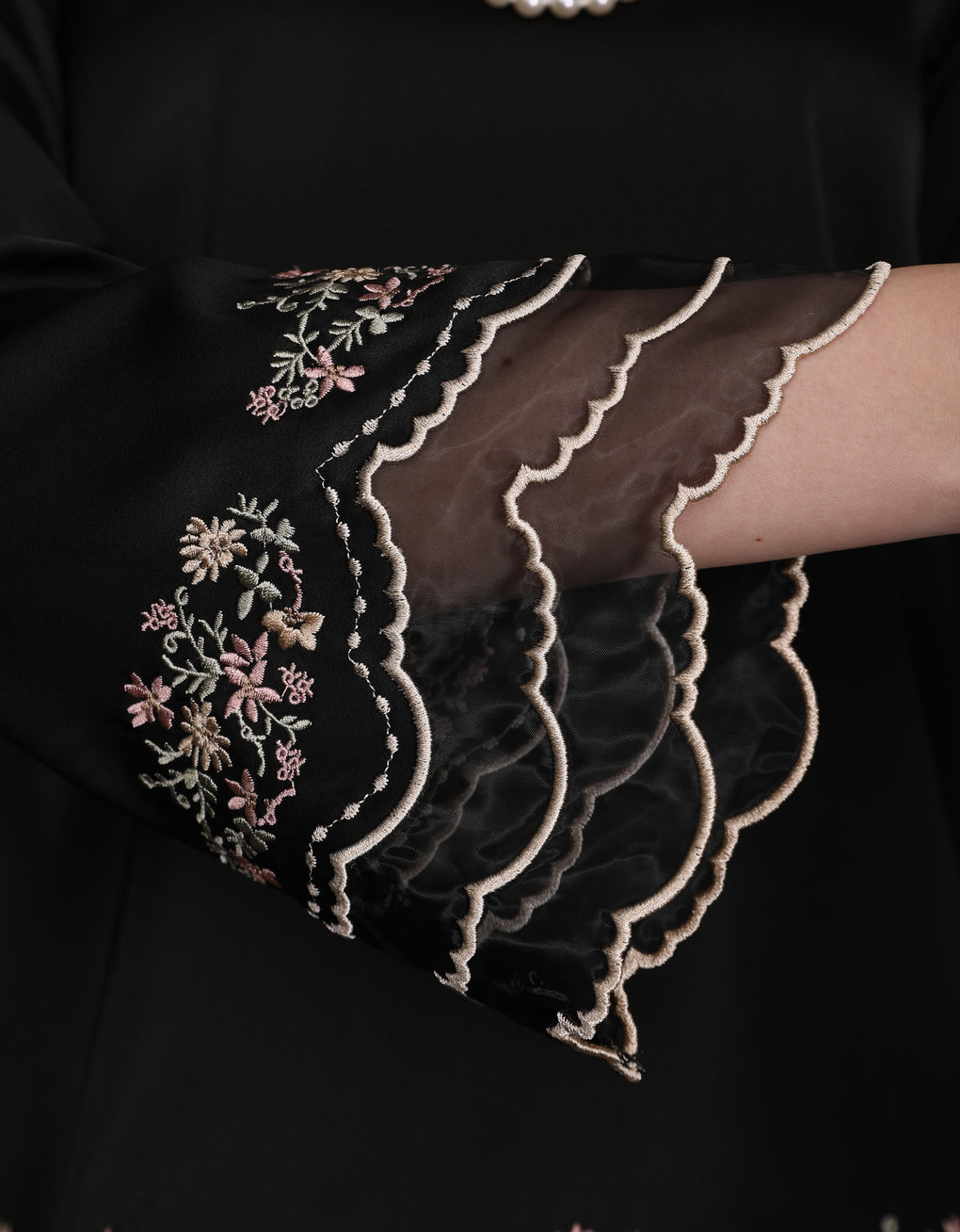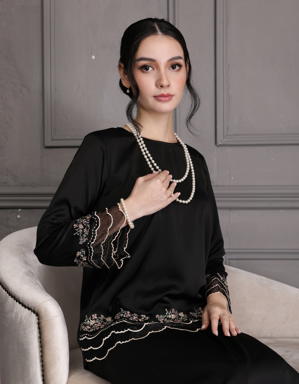 'Baju Kurung Moden Harriet’ combines classic charm with modern elegance. Made from silky Italian satin and detailed with fine multicolor embroidery on the sleeves and hem, it looks stunning, luxurious, and feminine — perfect for formal events or graceful daily wear.