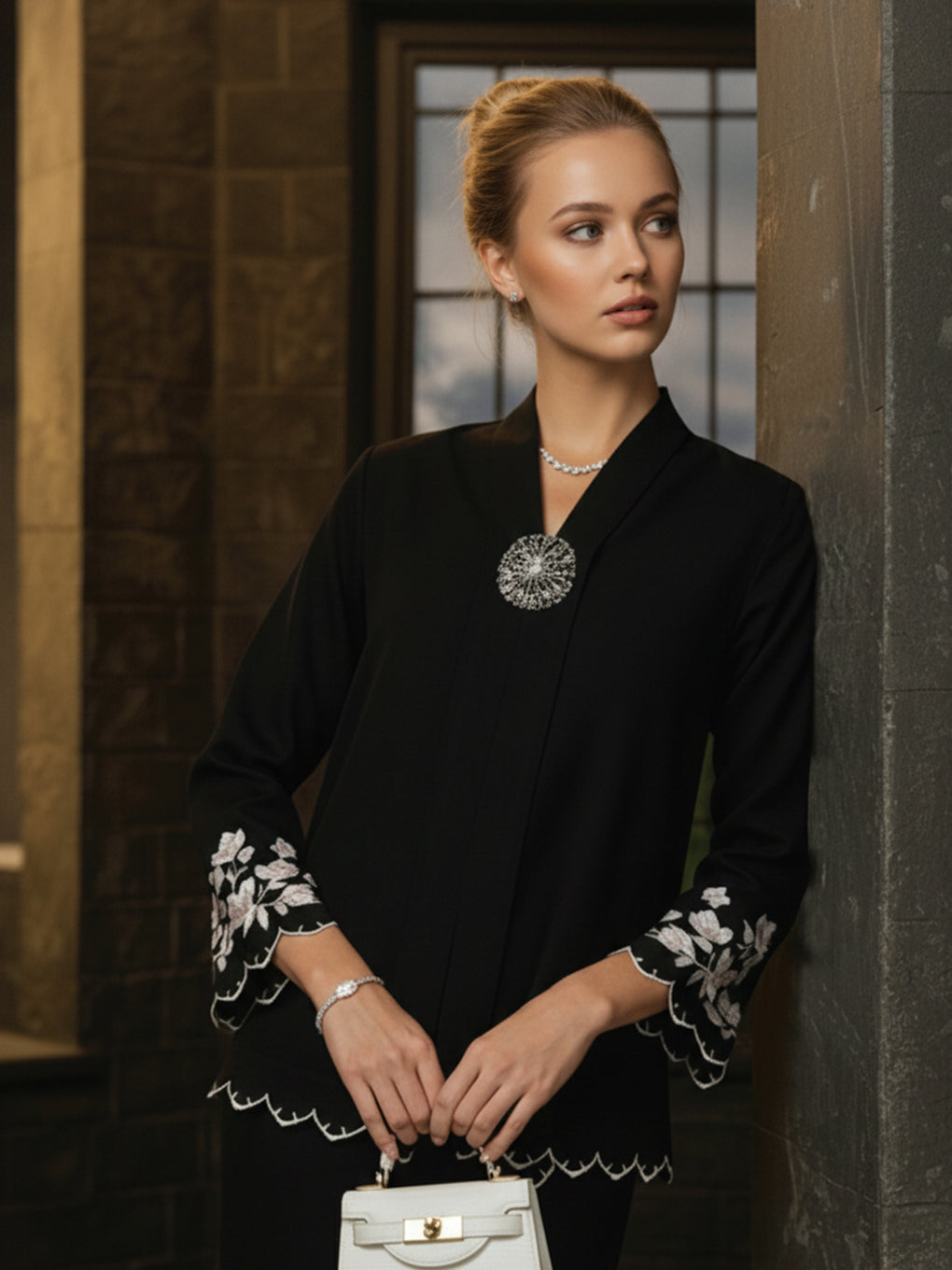 Crafted from premium Italian crepe and featuring intricate embroidery, this baju kebaya offers a form fitting silhouette with a slight stretch for comfort. Its soft touch to the skin makes it breathable and luxurious.