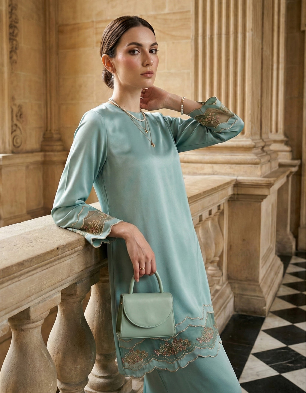 'Baju Kurung Pahang Moden Everlee' blends tradition with a modern touch. Crafted from luxurious Italian Silky Satin and adorned with multi-color embroidery, it offers both elegance and comfort in a long, flattering silhouette. A timeless choice for formal events or refined everyday wear.
