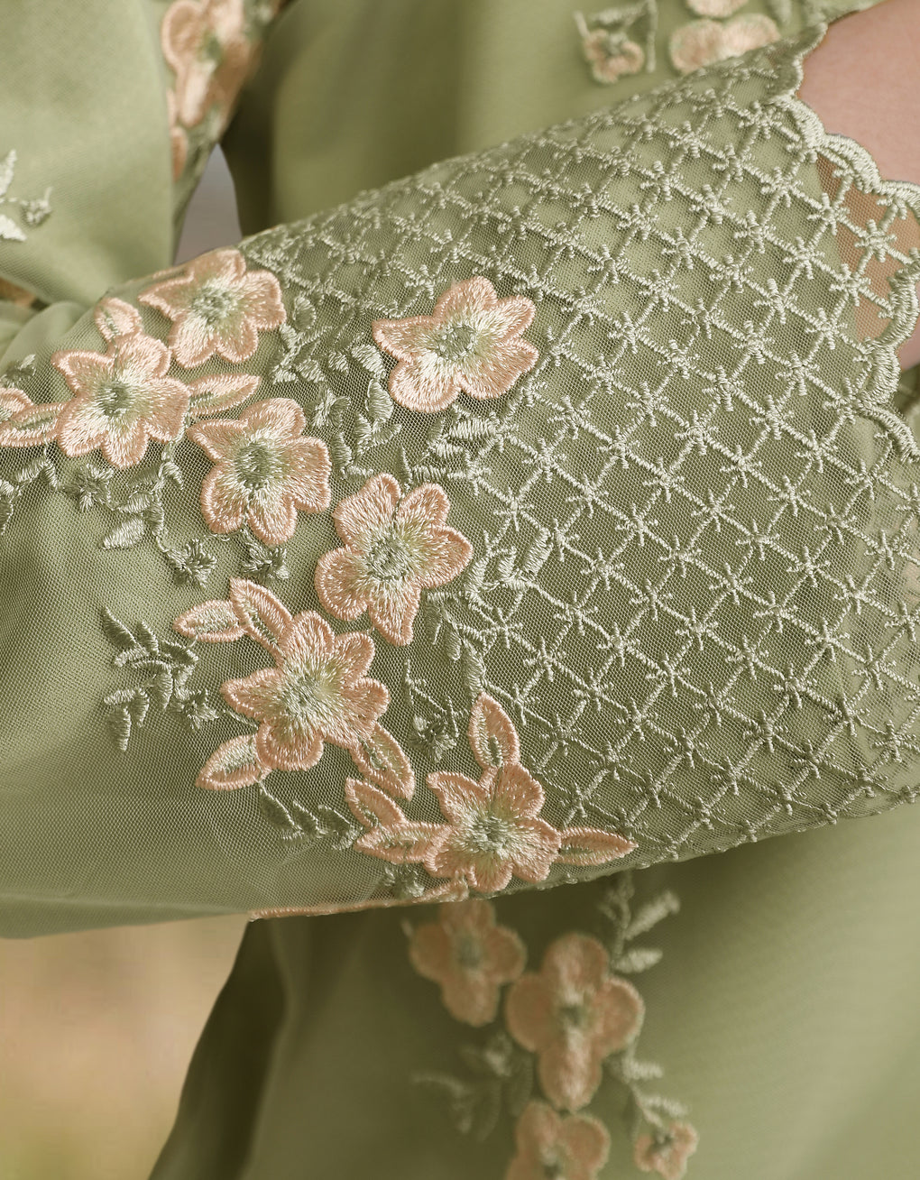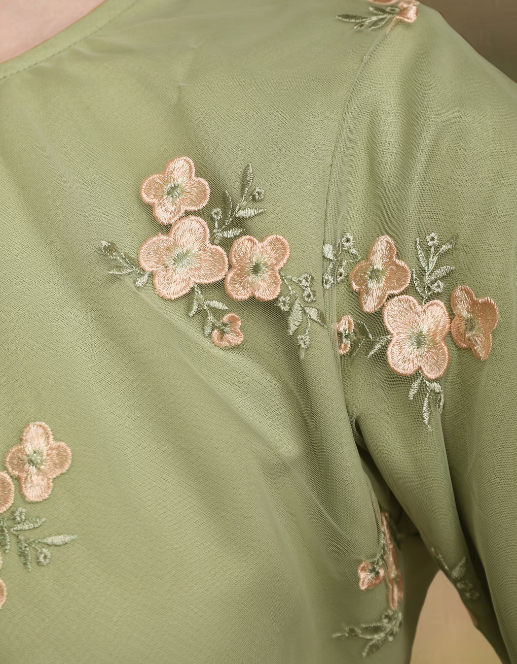 Crafted in a timeless Kedah cut, this piece ensures a comfortable fit for your little one. Delicate Floral Embroidered Lace and a subtly geometric hem create a graceful blend of femininity and elegance perfect for any occasion.