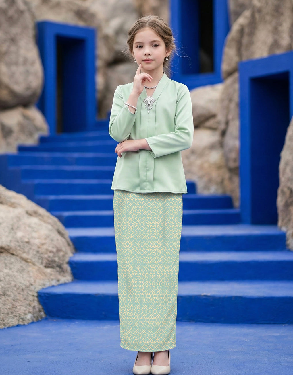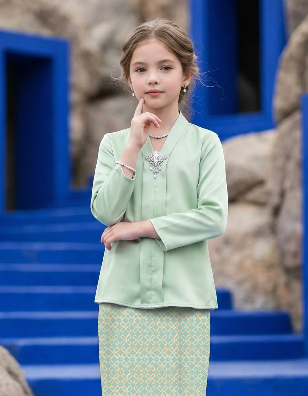 Introduce your daughter to timeless elegance with the Kids Baju Kebaya Melyra features a coordinated plain satin top paired with a beautifully printed satin skirt, designed for the modern family. The soft sage green hue complements all skin tones, while the premium satin fabric drapes gracefully for a polished appearance. Perfect for festive occasions, family portraits, or special celebrations, this mother-daughter ensemble creates a cohesive, sophisticated look. The quality construction ensures comfort throughout the day, making it an investment piece for memorable moments together.