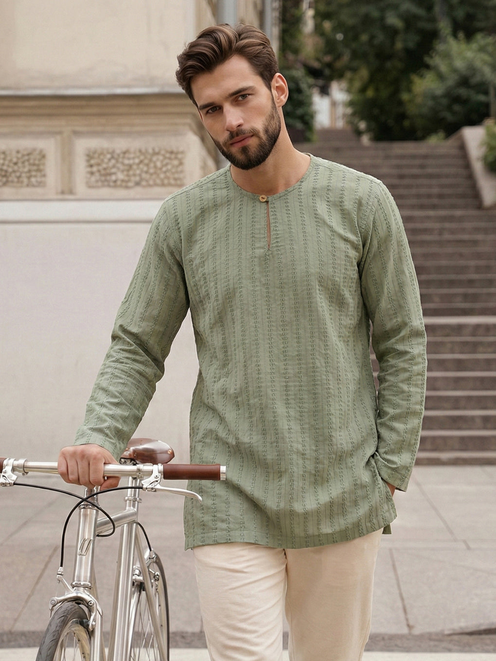 Elevate your style with premium shirred fabrics regular fit round neck kurta. The matched coloured buttons and long sleeves add a touch of sophistication, while the side pockets provides functionality and fashion. Perfect for any occasion, this kurta effortlessly combines comfort and elegance.