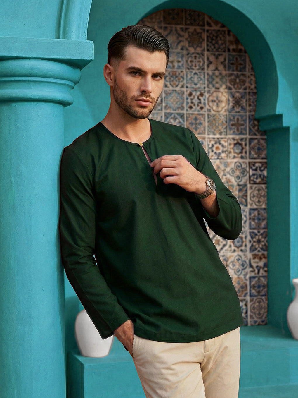Elevate your style with our regular fit round neck kurta. The matched coloured buttons and long sleeves add a touch of sophistication, while the side pockets provides functionality and fashion. Perfect for any occasion, this kurta effortlessly combines comfort and elegance.