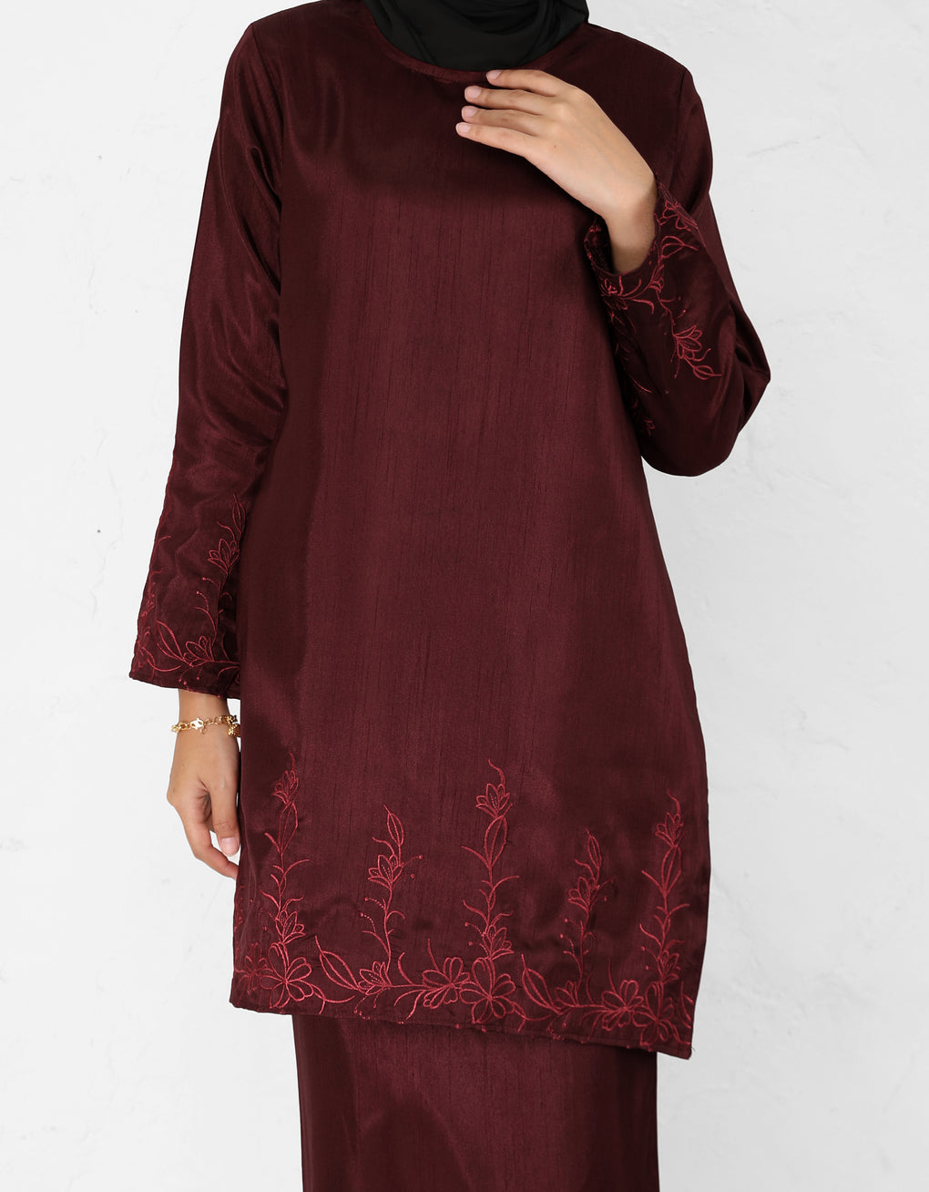 "Baju Kurung Pahang Moden Fianna" made from Shantung Embroidery. This garment features a long, graceful cut that brings out its elegant appeal. It's perfect for formal occasions or stylish everyday wear, making it a timeless piece for anyone who values both cultural heritage and modern fashion.