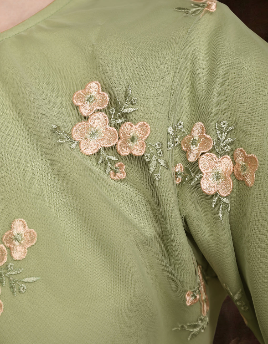 Crafted in a timeless Kedah cut, this piece ensures a comfortable fit for your little one. Delicate Floral Embroidered Lace and a subtly geometric hem create a graceful blend of femininity and elegance perfect for any occasion.
