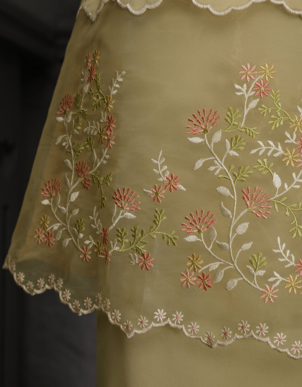 'Baju Kurung Pahang Moden Morana' blends tradition with a modern touch. Made from premium Italian Silky Satin, this piece features delicate embroidery on soft organdy that enhances its refined look. It offers both elegance and comfort in a long, flattering silhouette. A timeless choice for formal events or refined everyday wear.