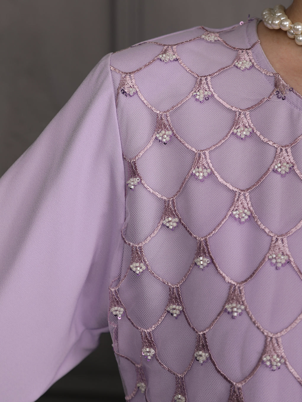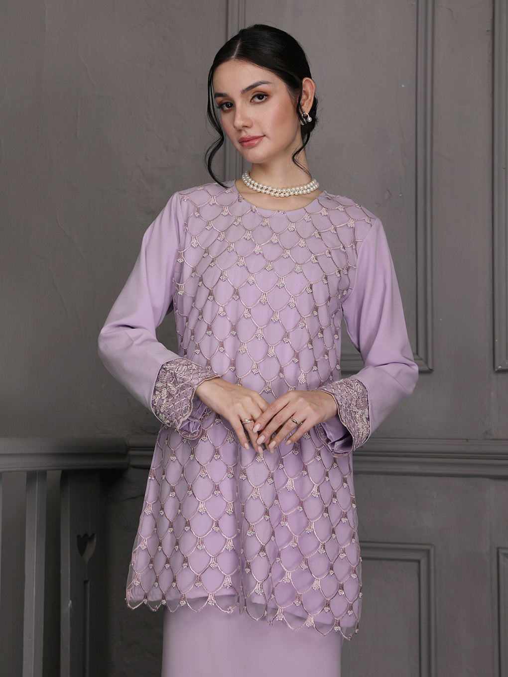 Baju Kurung Moden Idalia Luxurious and exclusive beaded lace delicately sewn for a rich and stunning look. The interlining are made of soft hand-feel jojo crepe fabric.