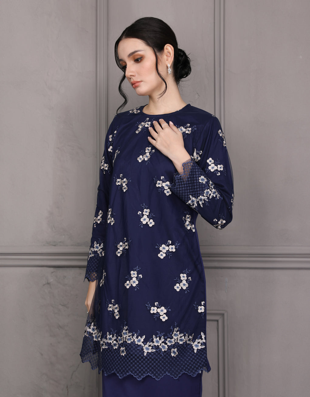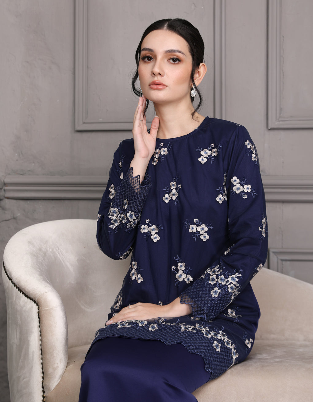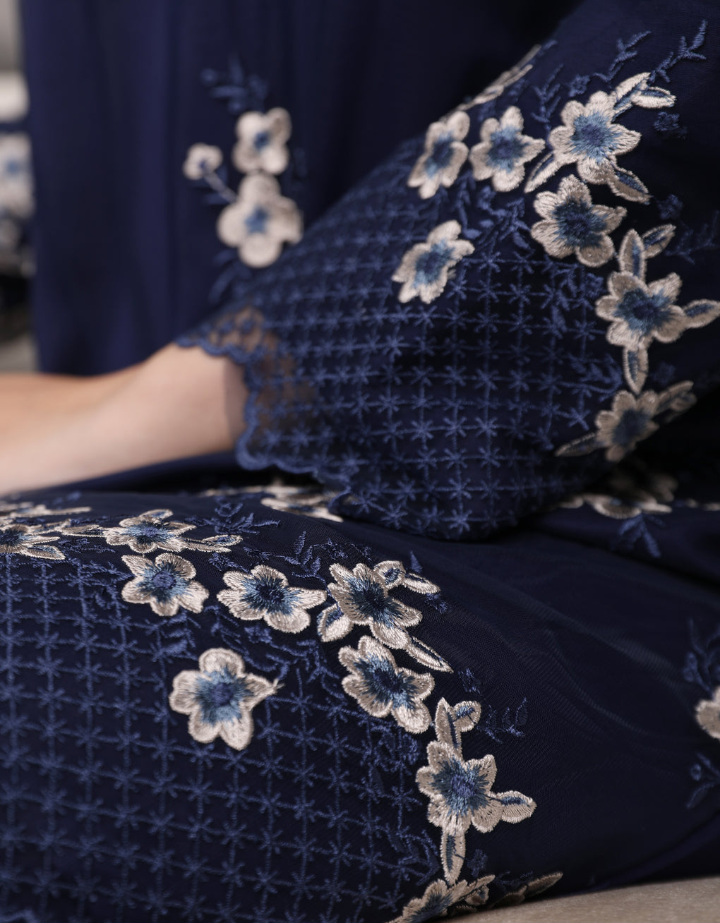 Crafted in a timeless Moden cut, this piece offers a comfortable fit. Delicate floral embroidered lace and a subtly geometric hem create a graceful blend of femininity and elegance perfect for any occasion.