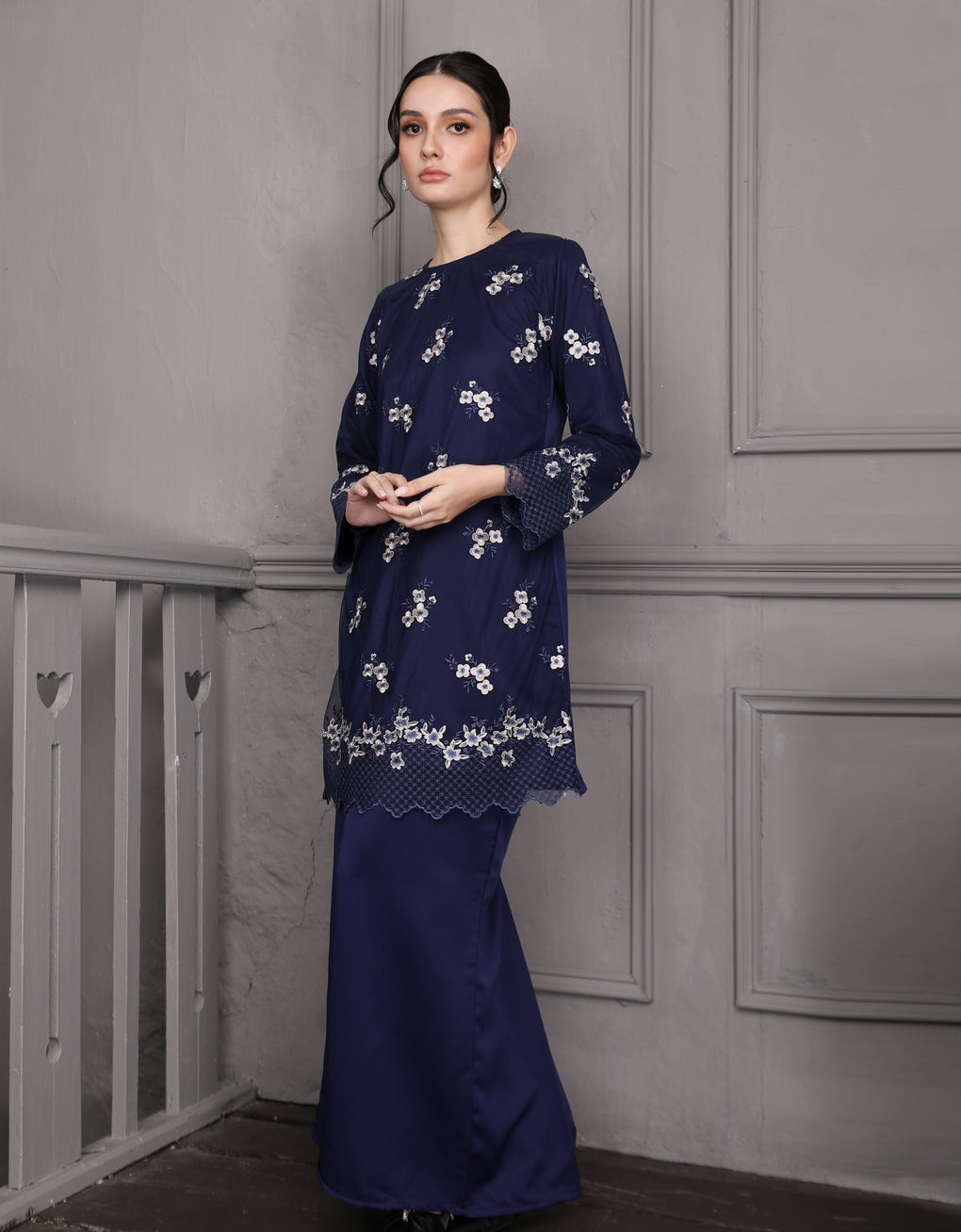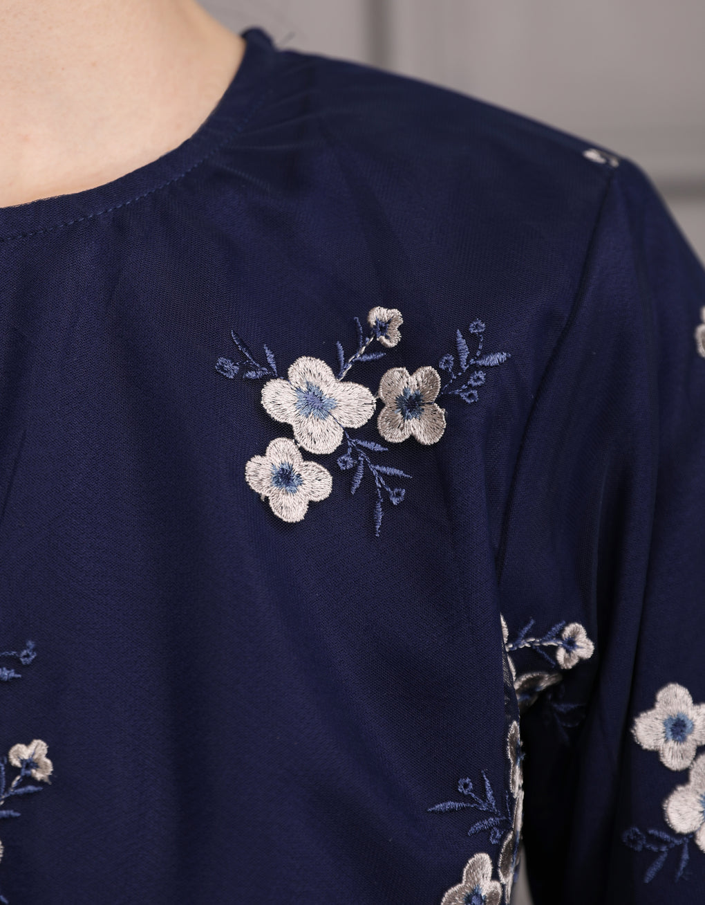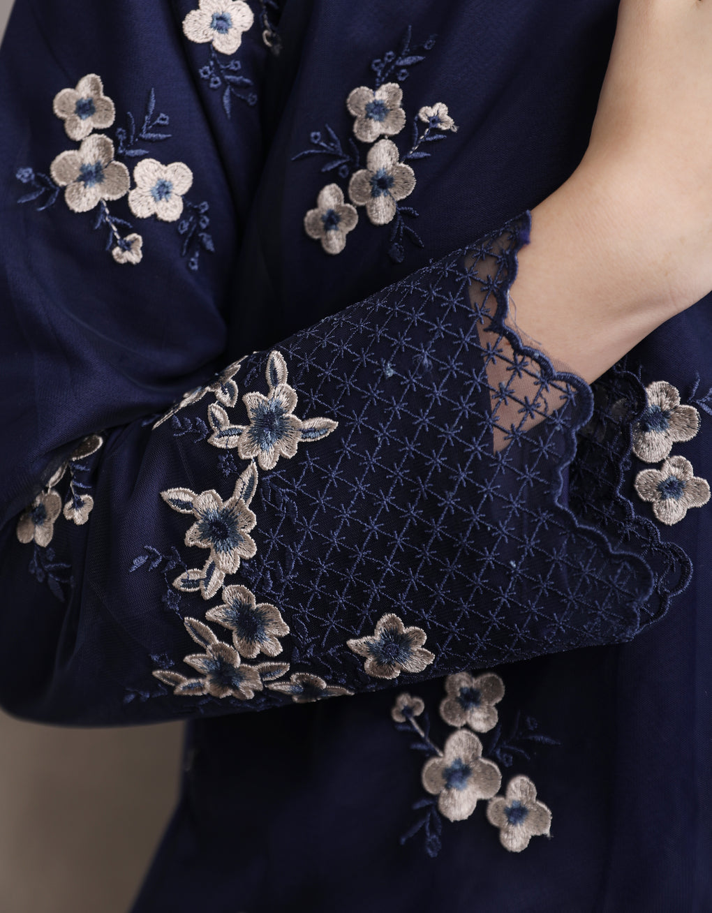Crafted in a timeless Moden cut, this piece offers a comfortable fit. Delicate floral embroidered lace and a subtly geometric hem create a graceful blend of femininity and elegance perfect for any occasion.