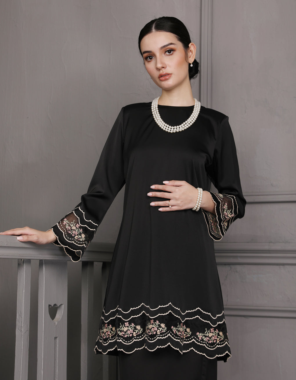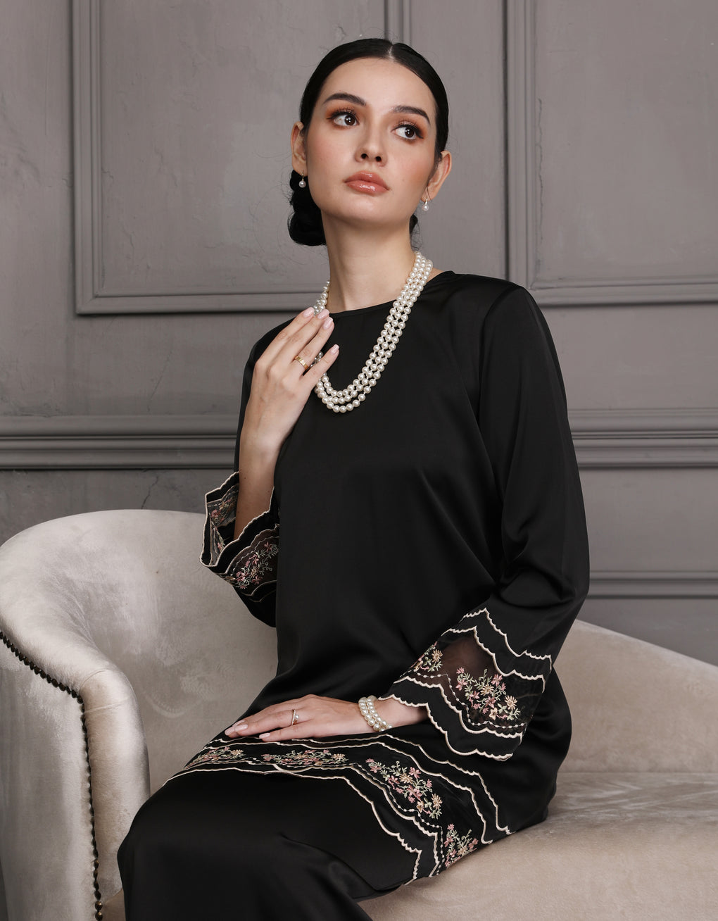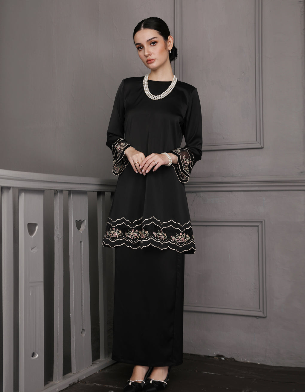 'Baju Kurung Pahang Moden Everlee' blends tradition with a modern touch. Crafted from luxurious Italian Silky Satin and adorned with multi-color embroidery, it offers both elegance and comfort in a long, flattering silhouette. A timeless choice for formal events or refined everyday wear.