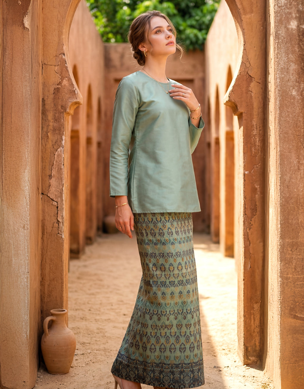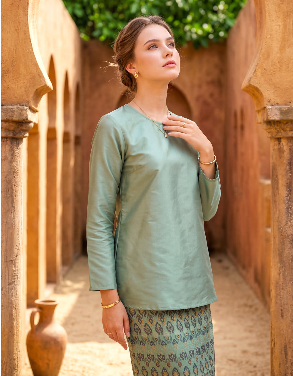 "Baju Kedah Teyja" blends timeless tradition with modern grace. Top Crafted from Tafetta and skirt from Jacquard. We serve you with four bolder colours options for this coming Raya. Pair it with either plain or printed scarves and you are good to go! It is a timeless piece which elevates our Karoline to look ultra feminine.