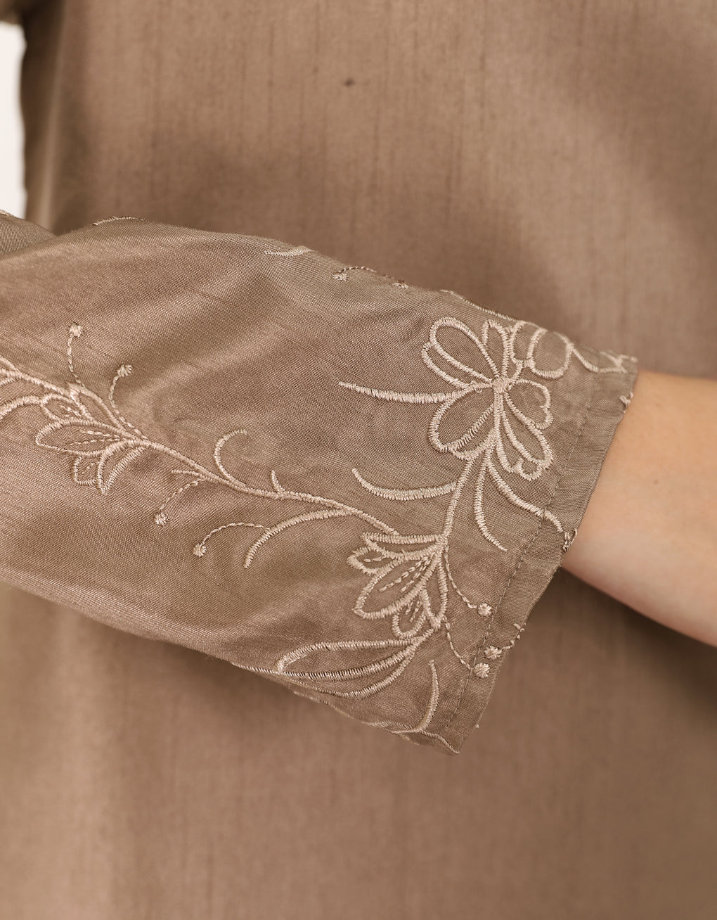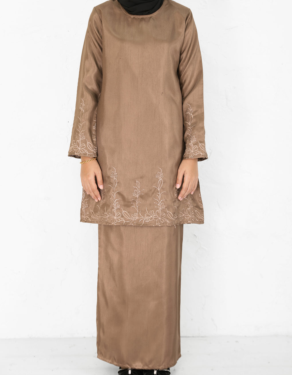 "Baju Kurung Pahang Moden Fianna" made from Shantung Embroidery. This garment features a long, graceful cut that brings out its elegant appeal. It's perfect for formal occasions or stylish everyday wear, making it a timeless piece for anyone who values both cultural heritage and modern fashion.